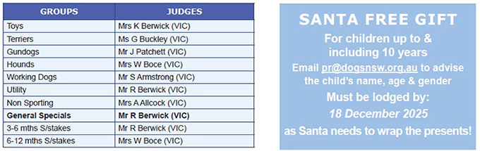 The DOGS NSW Public Relations Committee will be holding their Annual All Breeds Christmas Championship Show and Party on Saturday 20 December 2025 at Orchard Hills, with judging commencing from 6.00pm.